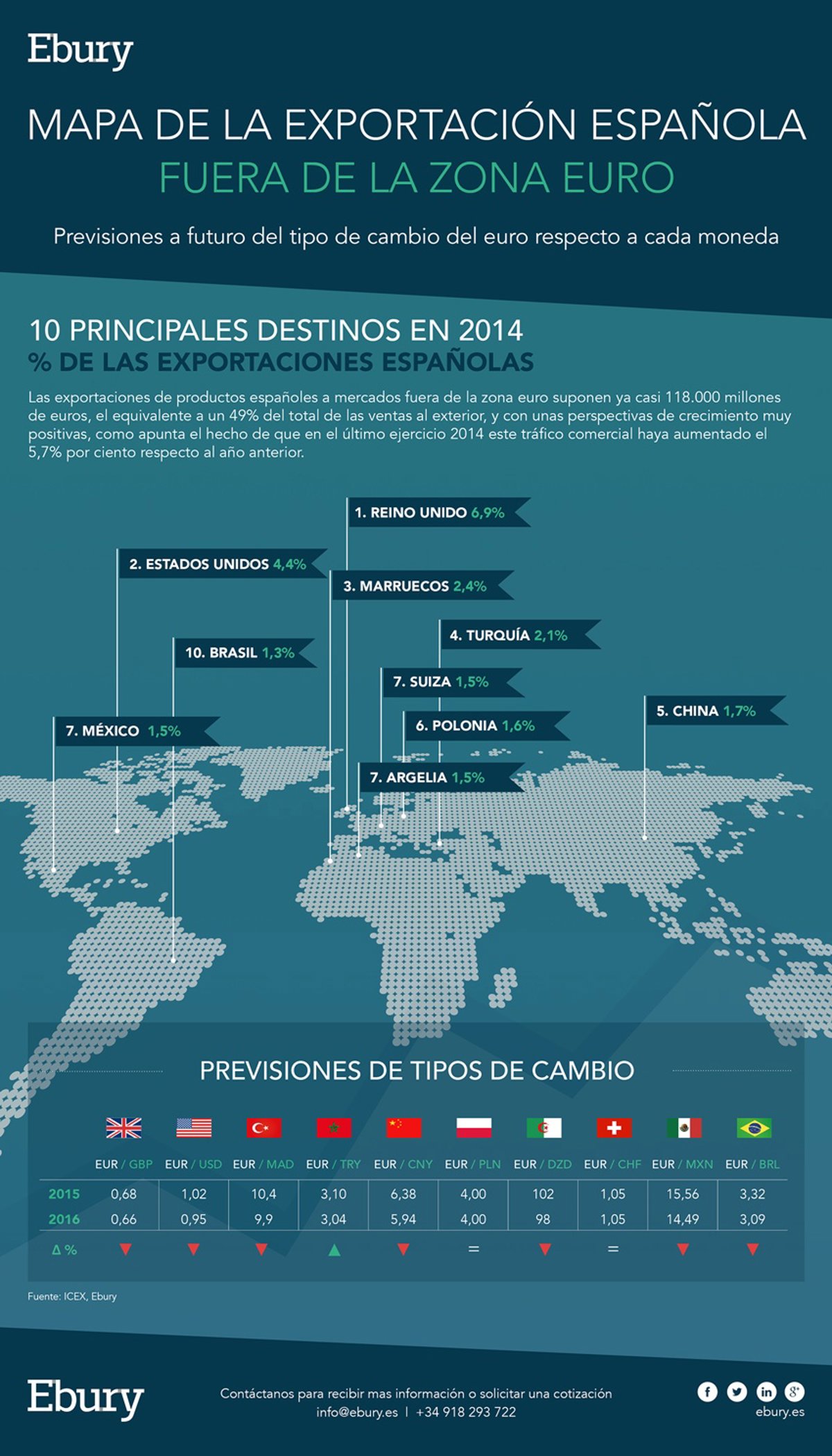 Según Ebury, el país más importante para las exportaciones españolas fuera de la eurozona es Reino Unido, con un 6,9% del total, seguido de Estados Unidos (4,4%), Marruecos (2,4%), Turquía (2,1%) y China (1,7%).