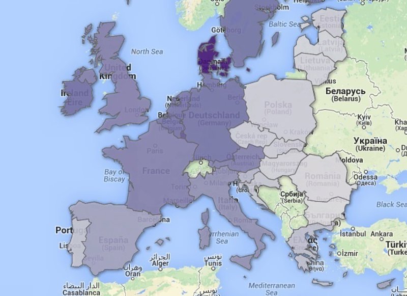 En este otro mapa puedes ver los salarios medios en los países del entorno europeo. Cuanto más intenso el morado, mayor es el salario. Puedes ver la cifra concreta pinchando sobre la región.
