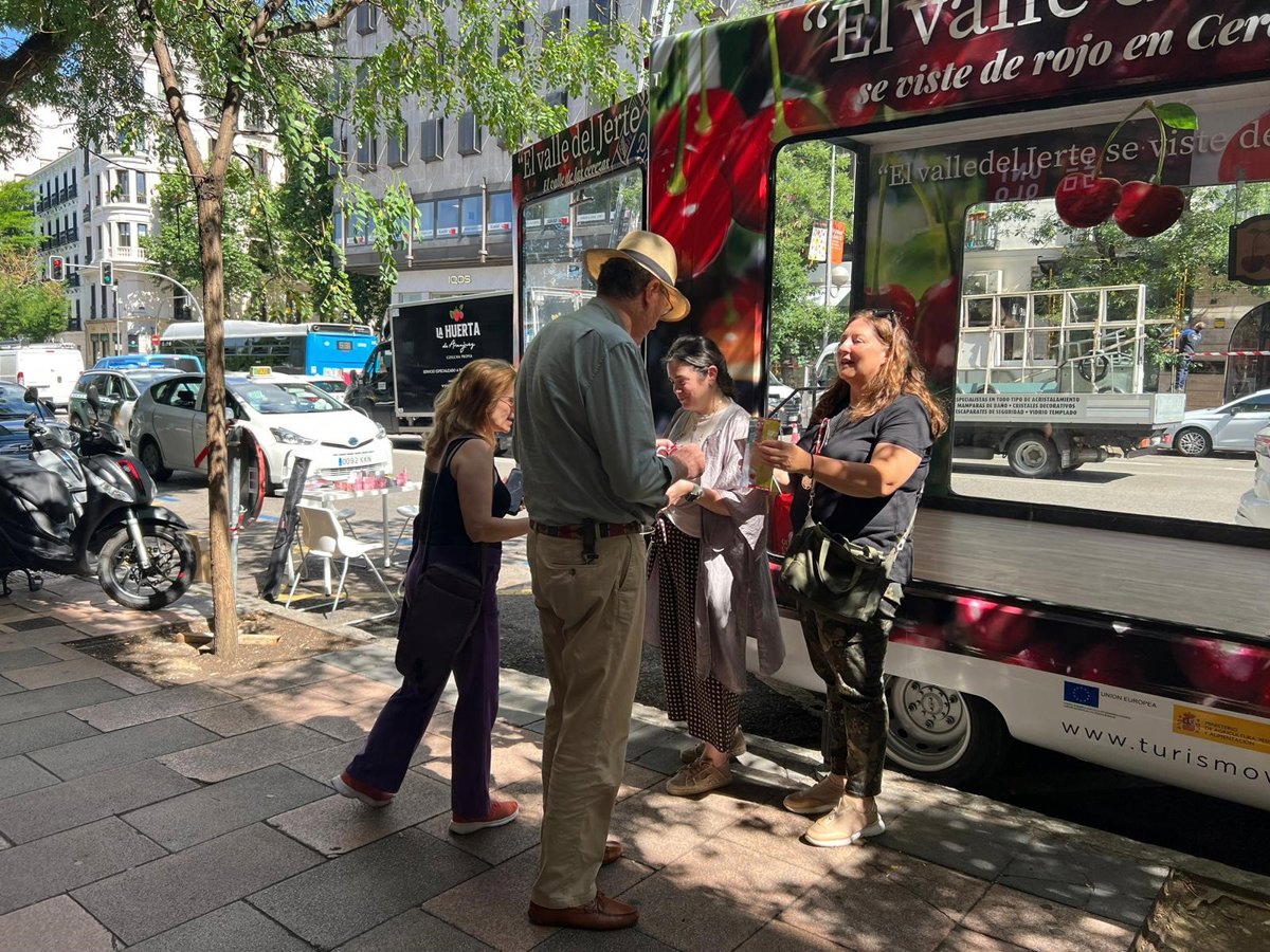 Durante estos dos días, una camioneta decorada con fotografías de productos del Valle del Jerte recorre calles del centro de la capital. La mañana de este miércoles el vehículo ha circulado por Paseo de la Castellana, la calle Velázquez, la calle Goya, la calle Alcalá y Atocha.
