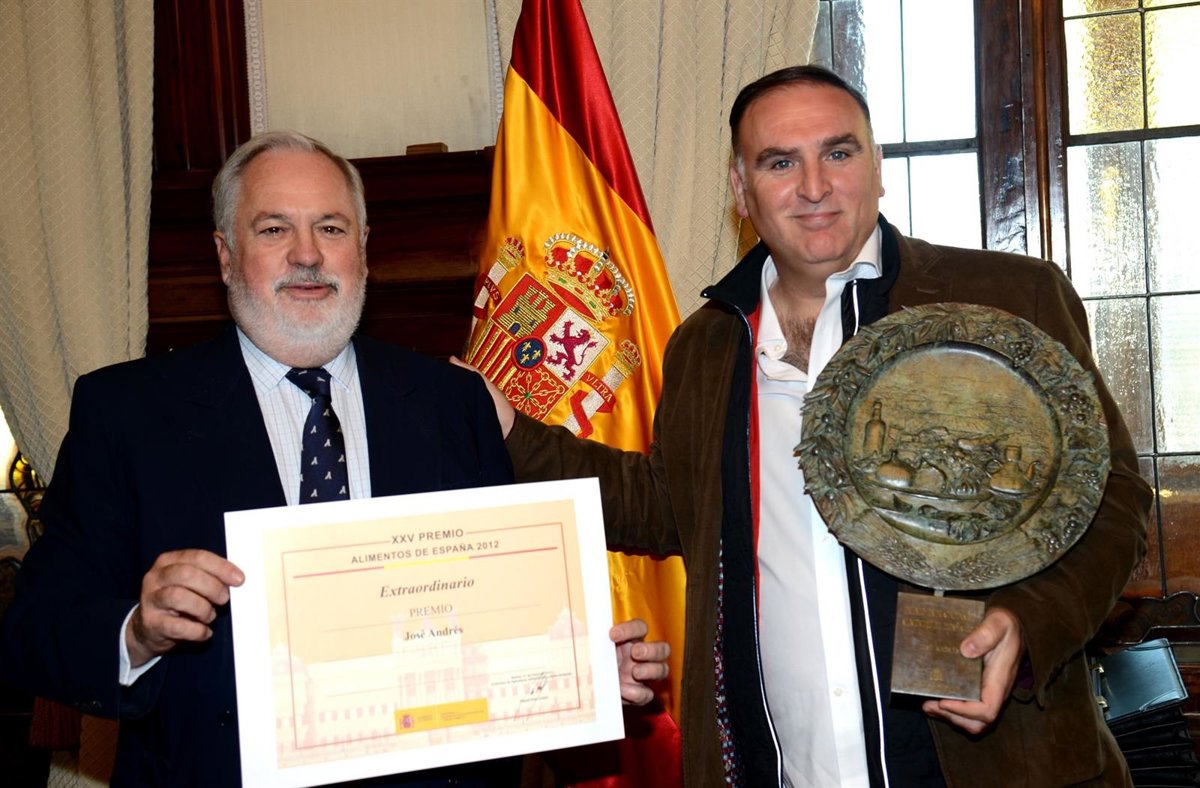 El ministro de Agricultura, Alimentación y Medio Ambiente, Miguel Arias Cañete, ha entregado este jueves en la sede del Ministerio, el Premio Extraordinario Alimentos de España 2012 al chef español José Andrés que, por motivos profesionales no pudo desplazarse a la ceremonia de entrega de los premios el pasado mes de octubre.