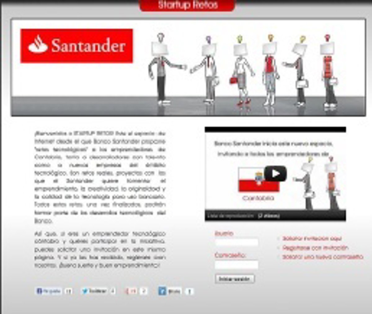 El Banco Santander ha puesto en marcha una iniciativa "pionera" para impulsar el emprendimiento tecnológico en Cantabria. Se trata del portal de Internet 'Startup Retos', donde se proponen distintos desafíos tecnológicos y se invita a que la comunidad de emprendedores cántabros compita por resolverlos.