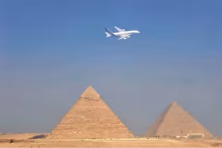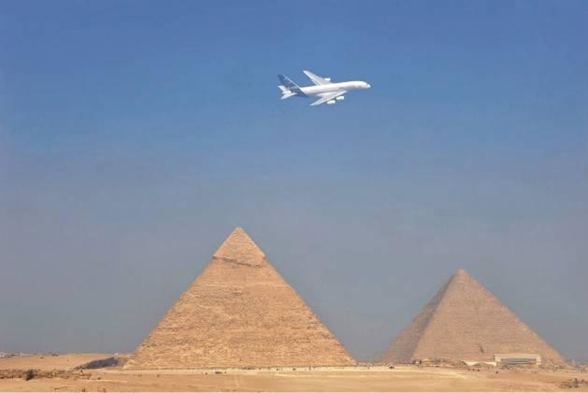 El A380, conocido como 'superjumbo', ha sobrevolado este miércoles las pirámides de Egipto para aterrizar por primera vez en el Norte de África en un vuelo especial, con motivo de la feria aeronáutica que se celebra esta semana en el aeropuerto internacional de Sharm El Sheij.