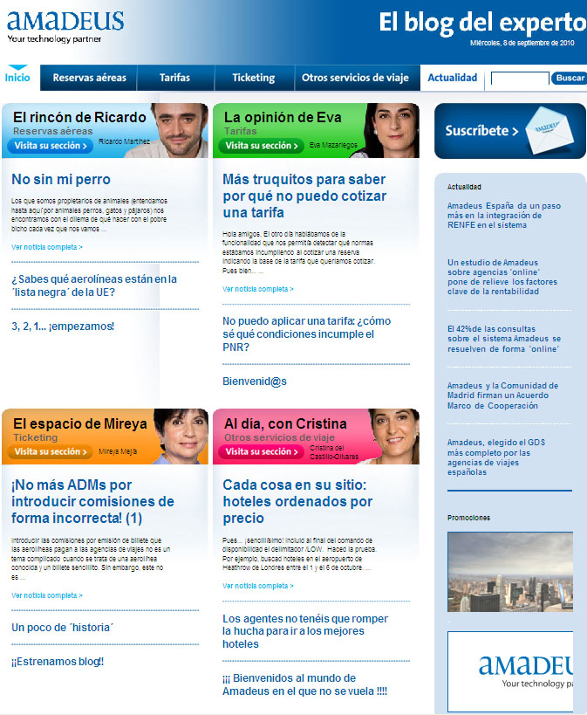 La iniciativa se concreta en el lanzamiento de cuatro blogs a cargo de cuatro expertos de diferentes áreas de negocio de Amadeus. Eva Mazariegos, experta en tarifas, se encargará de explicar todo lo concerniente a las tarifas aéreas.
