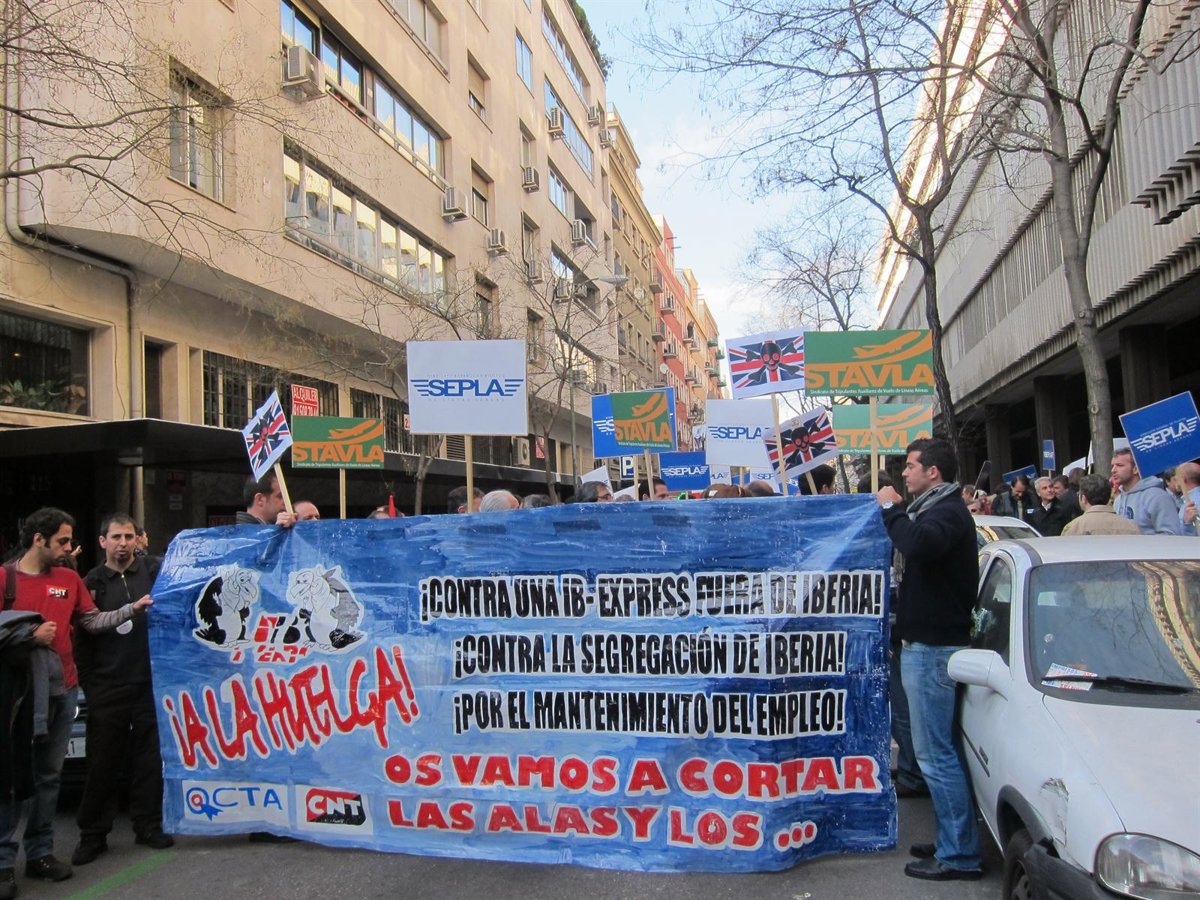 Centenares de trabajadores de Iberia se han manifestado esta tarde frente a la sede central de la aerolínea, en la calle Velázquez de Madrid, para mostrar su descontento por la creación de la nueva filial, Express, fuera de estructura de la aerolínea y en defensa de sus condiciones y puestos actuales dentro de la compañía.