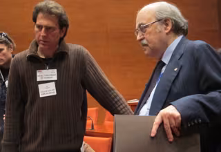 A la comparecencia han asistido cuatro representantes de los trabajadores que, al finalizar el acto, han intercambiado algunas palabras durante unos escasos minutos con Mas-Colell.