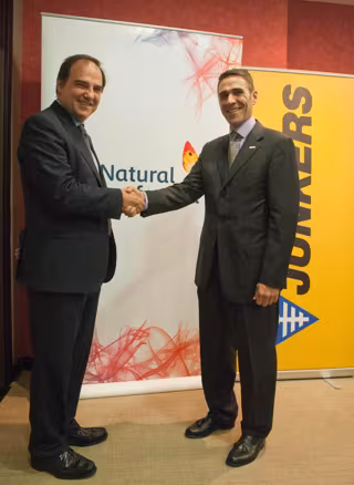 El director general de Gas Natural Distribución, José María Gil, y el de Bosch Termotecnia en Iberia, en representación de Junkers (del grupo Bosch), José Ignacio Mestre, han firmado un convenio para promover el uso de sistemas híbridos con gas natural para climatización.