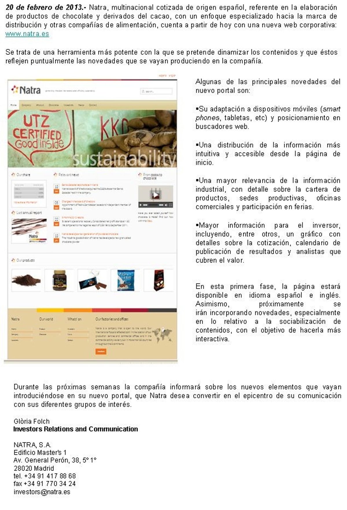 Natra, multinacional de origen español y referente en la elaboración de productos de chocolate y derivados del cacao, lanza desde este miércoles su web corporativa (www.natra.es), según informa la compañía en un comunicado.