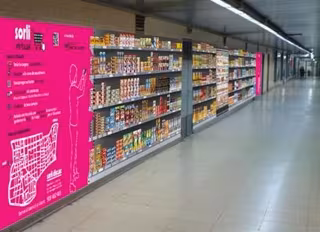 Consiste en una lámina con la imagen de un lineal, cuyos productos se pueden comprar fotografiando con el móvil el código QR que acompaña a cada producto, que se envía al domicilio del cliente.