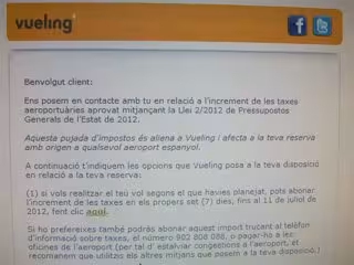 Los pasajeros que hayan realizado su reserva entre el 26 de junio y el 1 de julio quedan libres de pagar este recargo, que es ajeno a Vueling y que se abonará directamente al Estado.