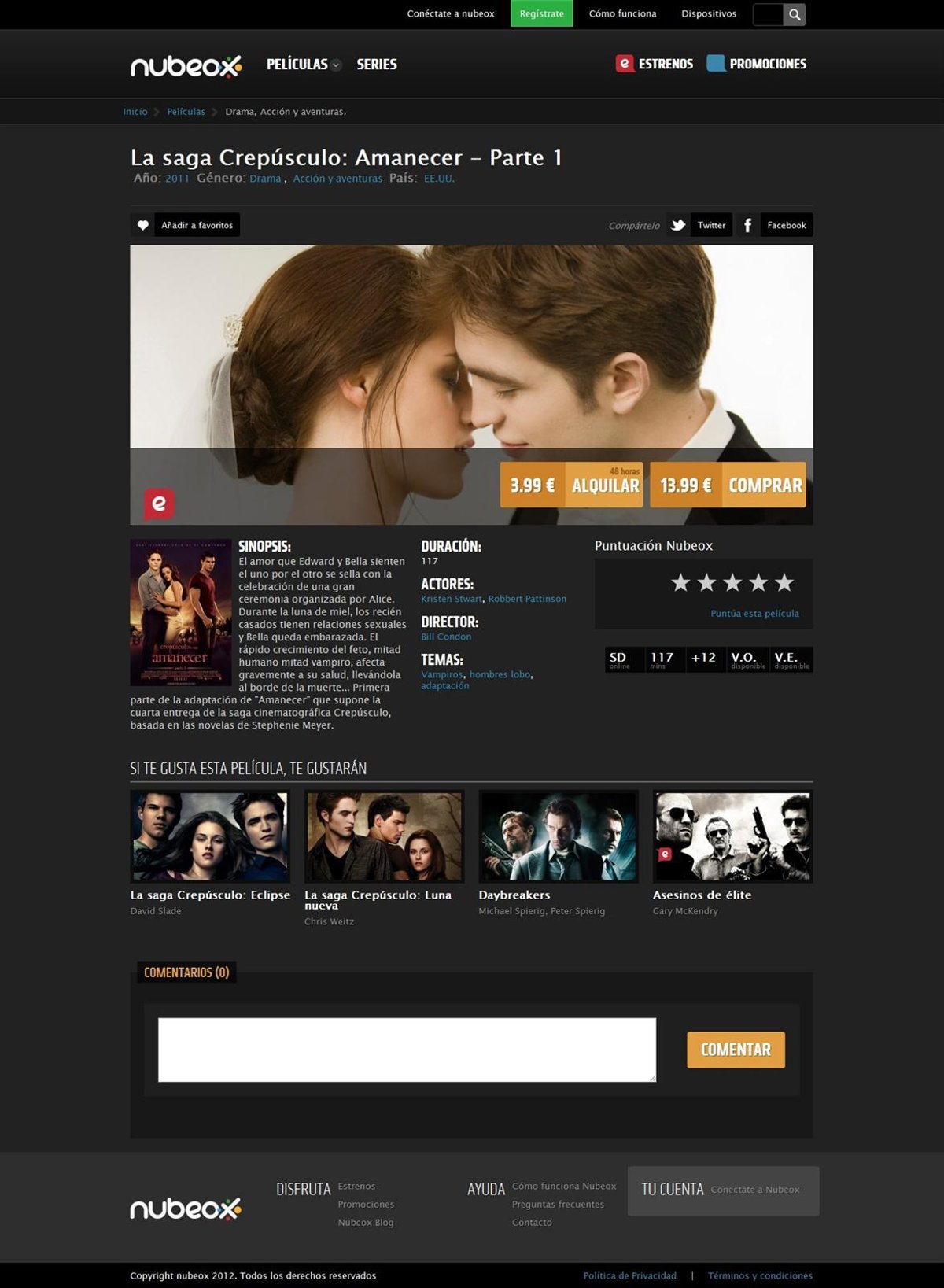 Los precios del alquiler en Nubeox oscilan entre los 0,99 y los 3,99 en calidad SD (añadiéndose 1 euro en cada caso para la opción en HD). En cuanto a las compras, los rangos de precios son muy diversos, en función de que se trate de una película de estreno, de catálogo de librería, capítulo de serie o temporada completa (entre los 4,50 y los 13,99 euros).