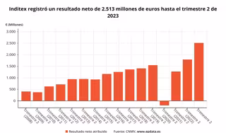 Inditex registró un beneficio neto de 2.513 millones de euros durante el primer semestre de su ejercicio fiscal 2023-2024 (entre el 1 de febrero y el 31 de julio), lo que supone un incremento del 40,1% respecto al mismo periodo de un año antes, según ha informado este miércoles la compañía, que vuelve a lograr nuevos récords con sus resultados y a superar las previsiones de los analistas.
