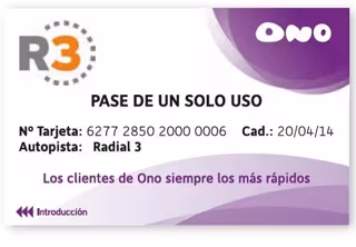 Ono regalará tarjetas de peaje para que los clientes puedan utilizar entre el miércoles 16 de abril y el lunes 21 de abril en las autopistas radiales de la Comunidad de Madrid R2, R3, R4 y R5 y así tener un pase gratuito en las mismas durante las vacaciones de Semana Santa.
