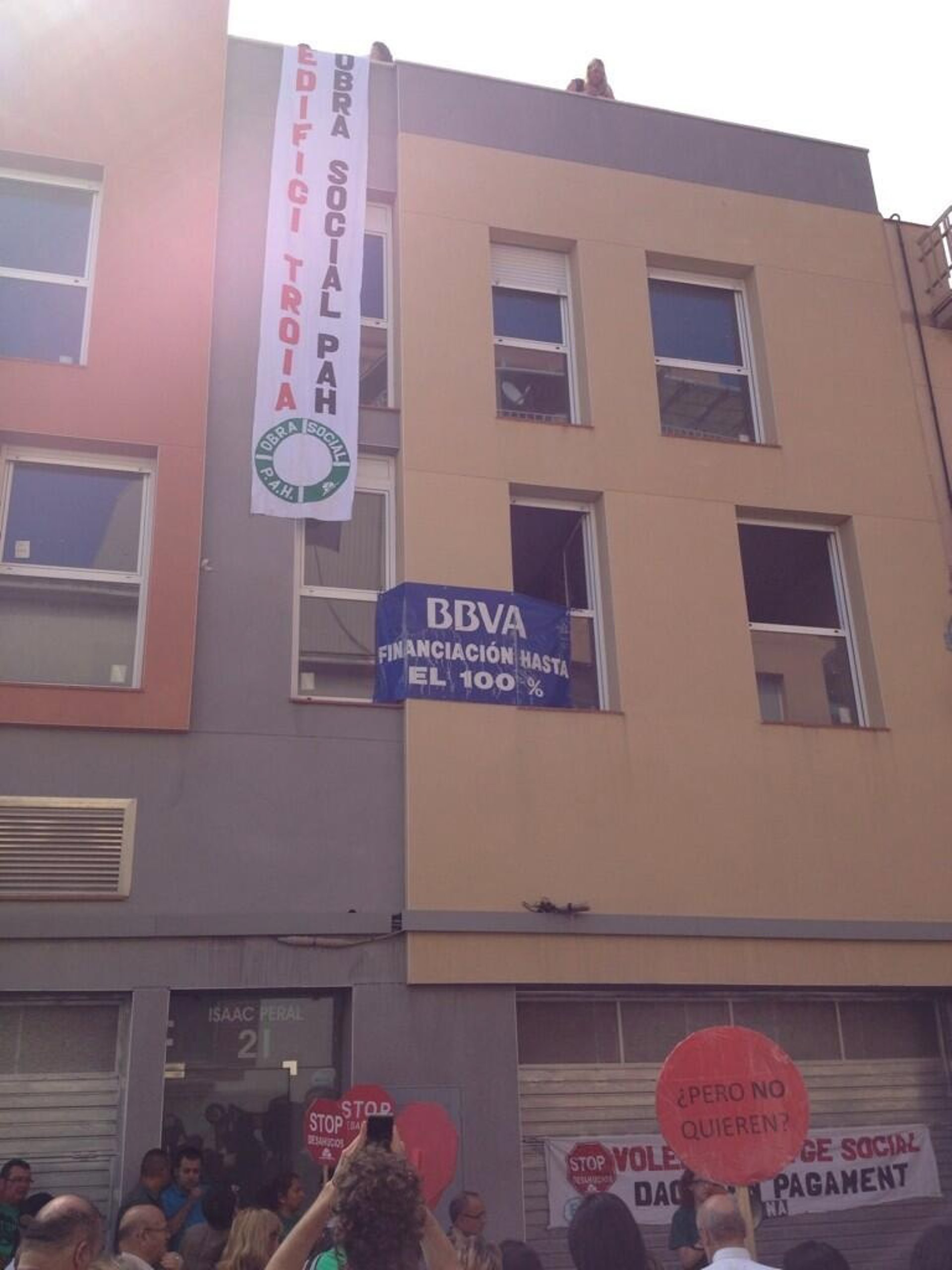 La Plataforma de Afectados por la Hipoteca (PAH) ha ocupado el edificio de viviendas de la calle Isaac Peral 21 de Badalona (Barcelona), que el BBVA tenía en venta, y en el que se han alojado cinco familias.