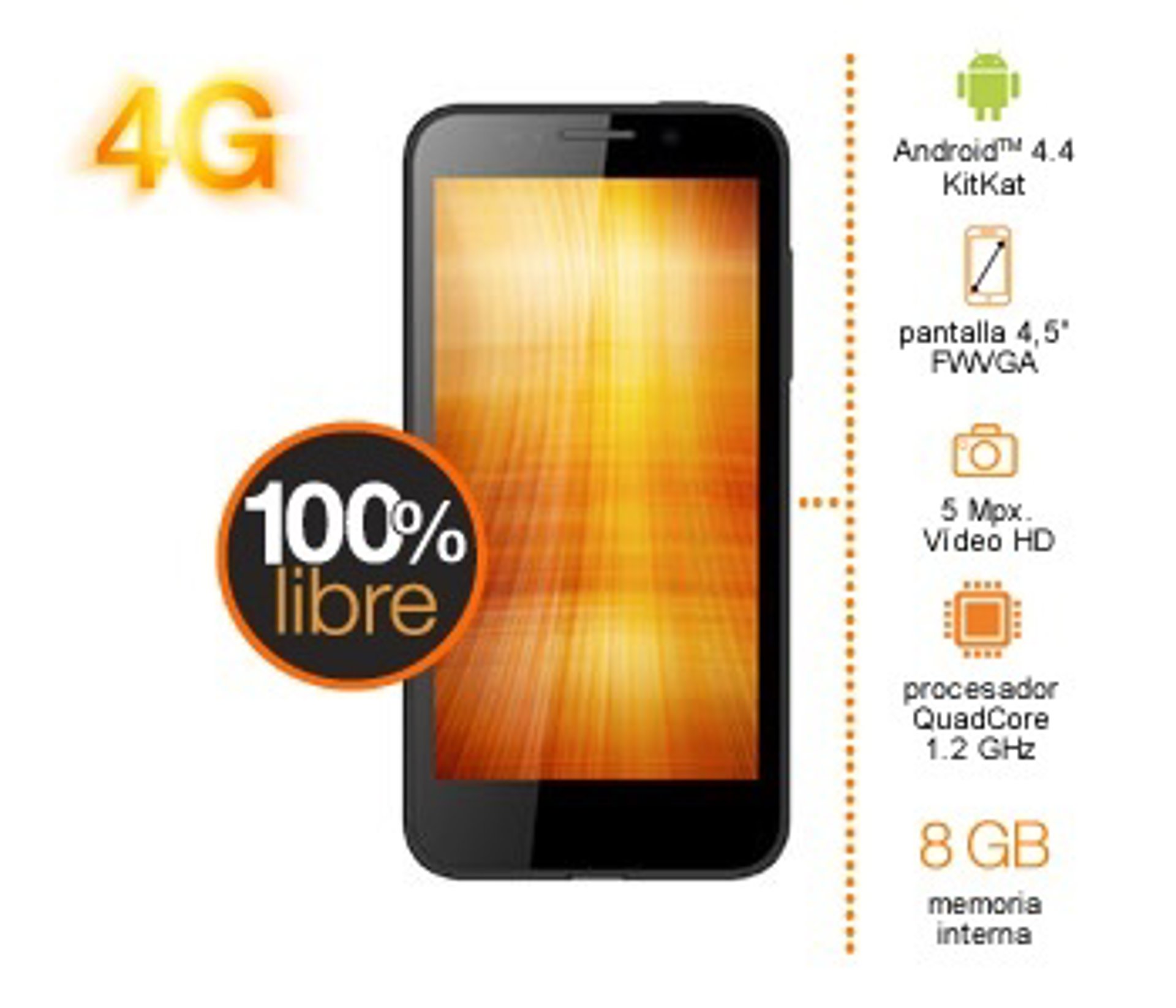 'Orange Hi 4G' cuenta con una pantalla de 4,5 pulgadas, una cámara de 5 megapíxeles y dispone de la última versión del sistema operativo Android 4.4 y un procesador Qualcomm de Cuatro Núcleos que corre a 1.2 GHz.