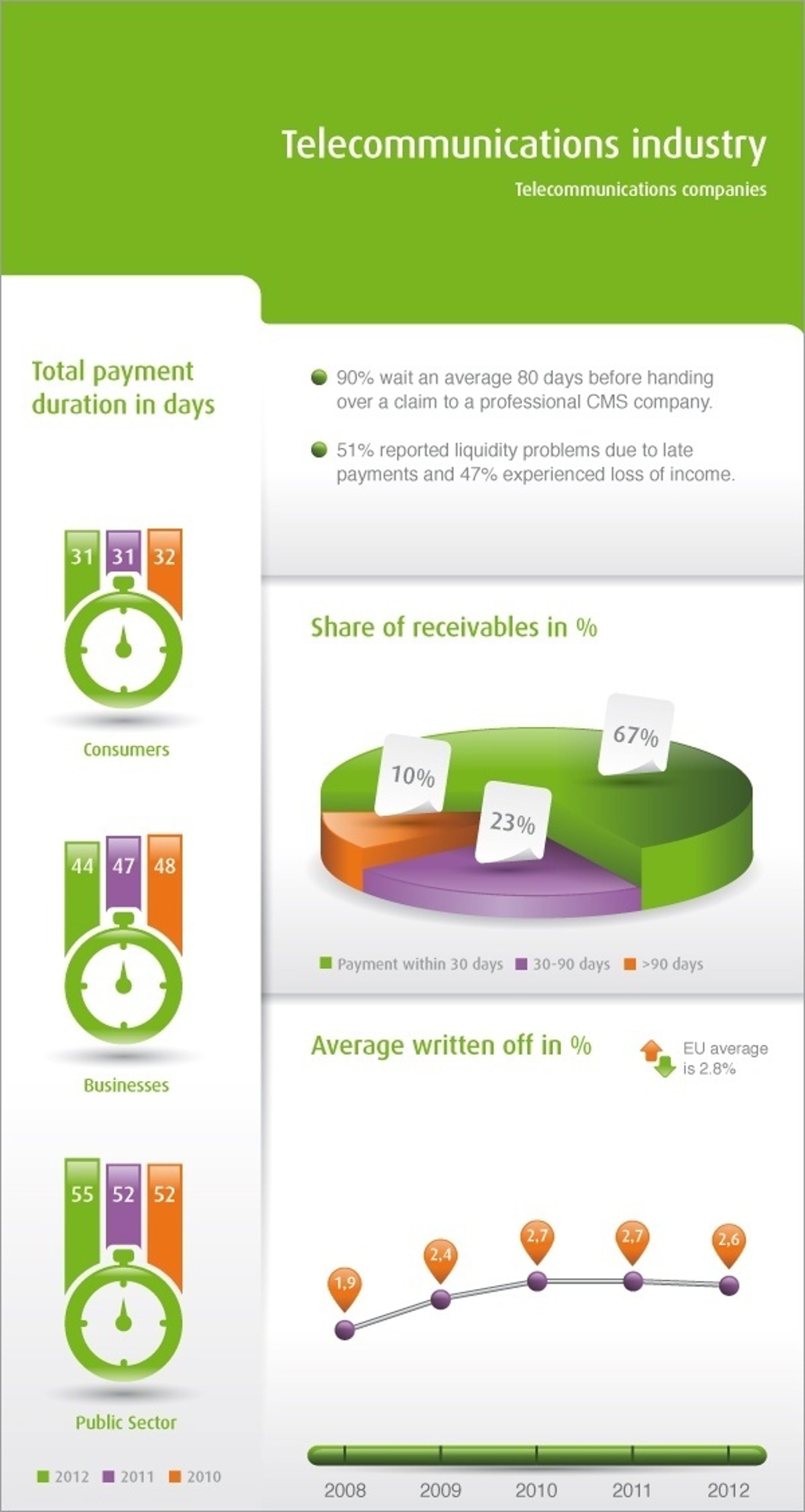 El sector de las telecomunicaciones en Europa ha reducido sus pérdidas por impago una décima porcentual en 2012 hasta el 2,6% desde el 2,7% del 2011, según la multinacional especializada en servicios de gestión de crédito Intrum Justitia.