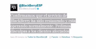"Confirmamos que el servicio de BlackBerry ha sido restaurado y esta operando normalmente. Pedimos disculpas a los clientes afectados", anunció la empresa desde el Twitter oficial de BlackBerry España.