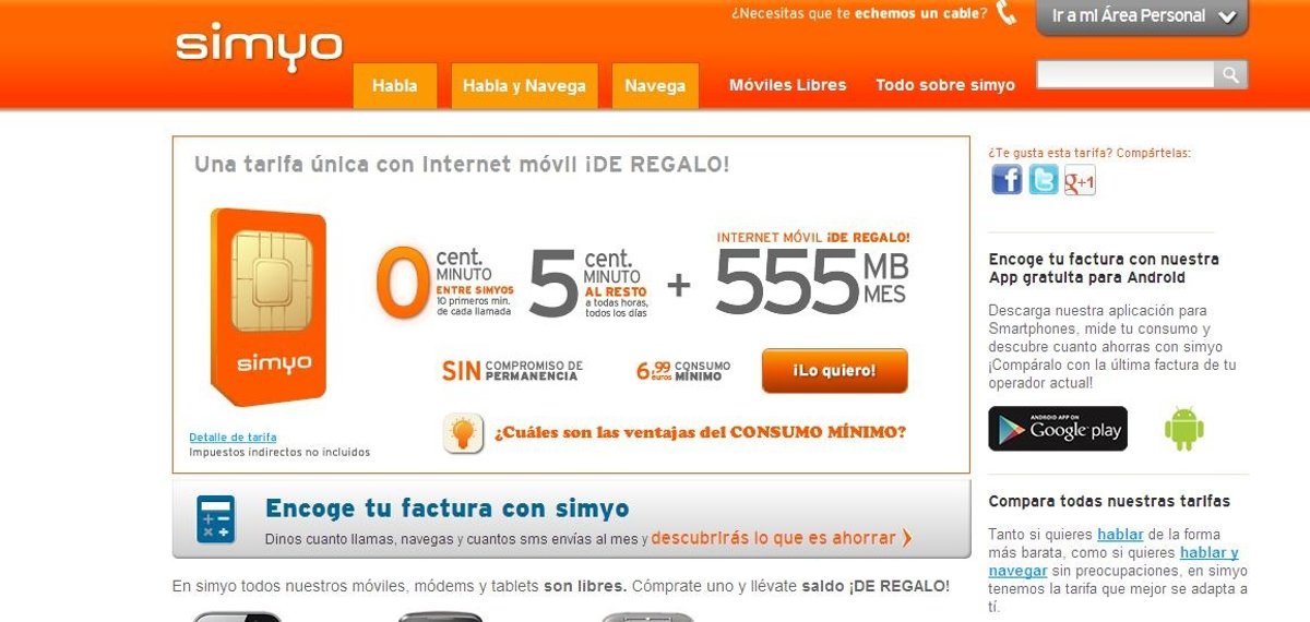 Además, esta tarifa regala 555 MB de datos de Internet móvil, todo ello con un consumo mínimo de 6,99 euros.