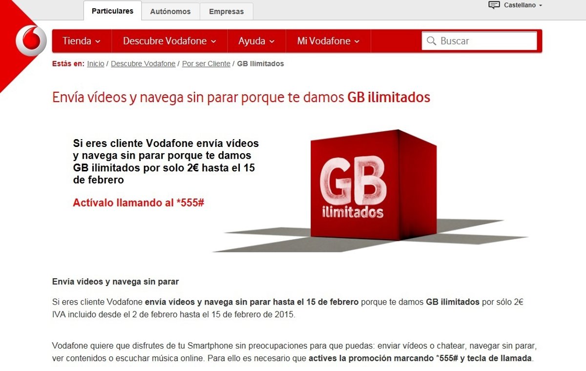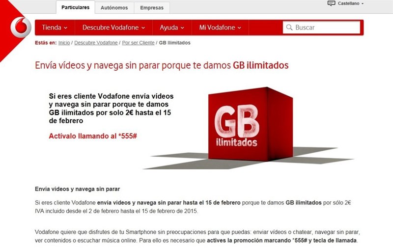 Vodafone España ofrecerá a sus clientes, tanto particulares como de empresas, datos ilimitados desde este lunes hasta el 15 de febrero (ambos inclusive) por 2 euros (IVA incluido), según ha informado la compañía.
