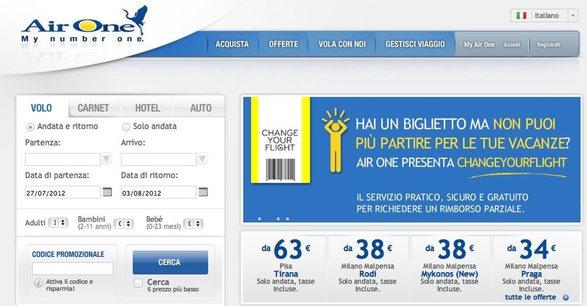 La filial de bajo coste de Alitalia (Air One) ofrece a los pasajeros de Baleares y Barcelona la posibilidad de recuperar el dinero de sus billetes de avión no utilizados gracias a la aplicación 'Changeyourflight', según informó la aerolínea en un comunicado.