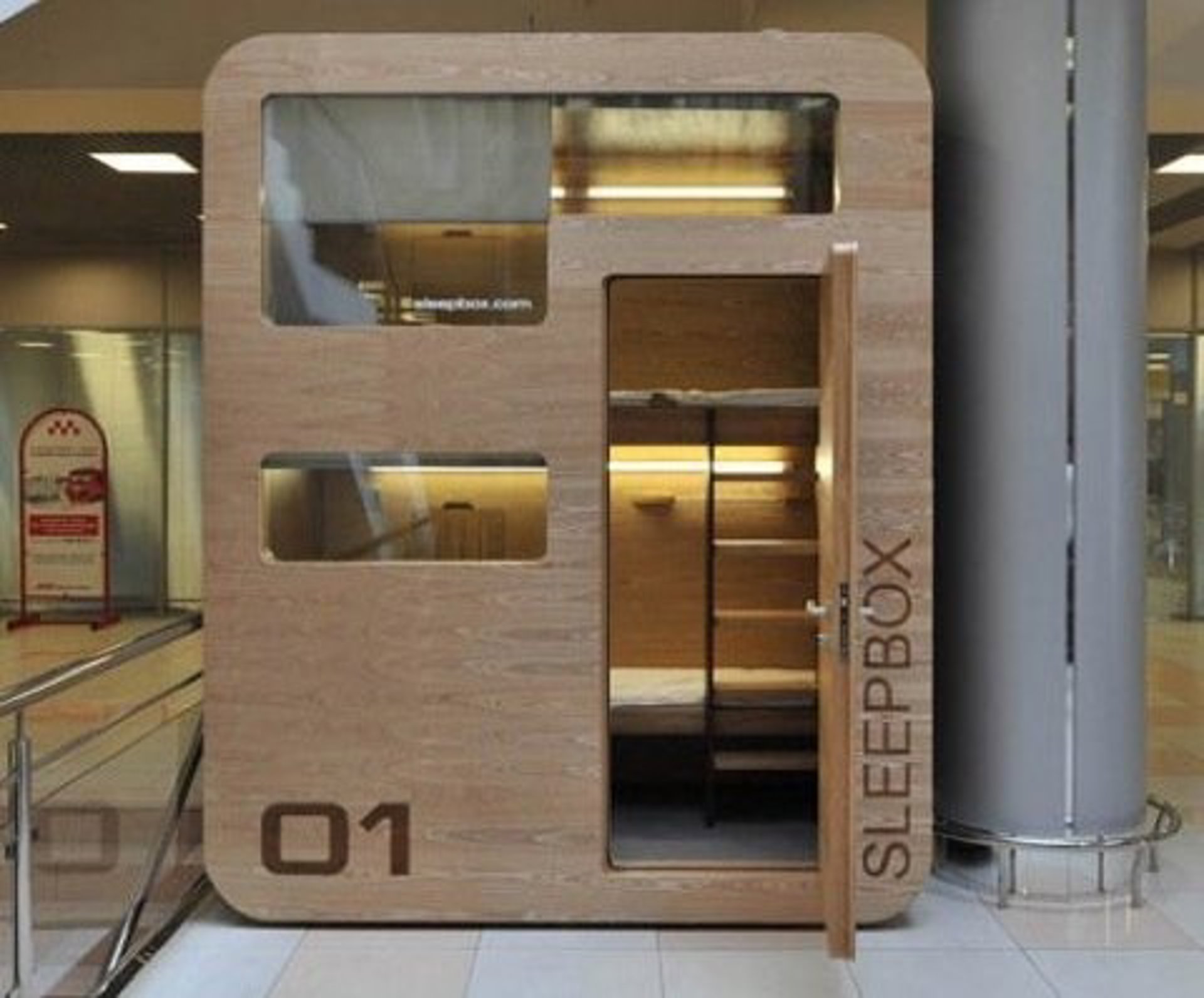 El espacio interior se ilumina a través de luces LED y puede recibir hasta tres personas que necesiten descansar antes de continuar su viaje. Tiene compartimientos y estantes para guardar equipajes y una bandeja para poder trabajar con el ordenador personal.