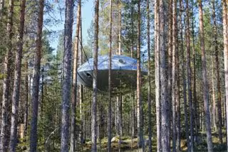 La cadena sueca Treehotel ha añadido un nuevo alojamiento a su original portafolio: una nave espacial de 30 metros cuadrados colgada entre árboles con sitio para una familia de cuatro miembros con acceso a través de una escalerilla