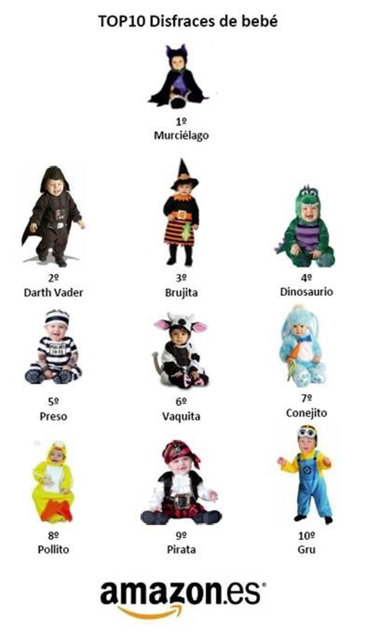 Amazon.es también ha destacado la venta de disfraces para los bebés, que han registrado un aumento del 130%. De acuerdo con los datos de la compañía, los disfraces más populares en las guarderías este Halloween son los de murciélago, Darth Vader y de bruja.