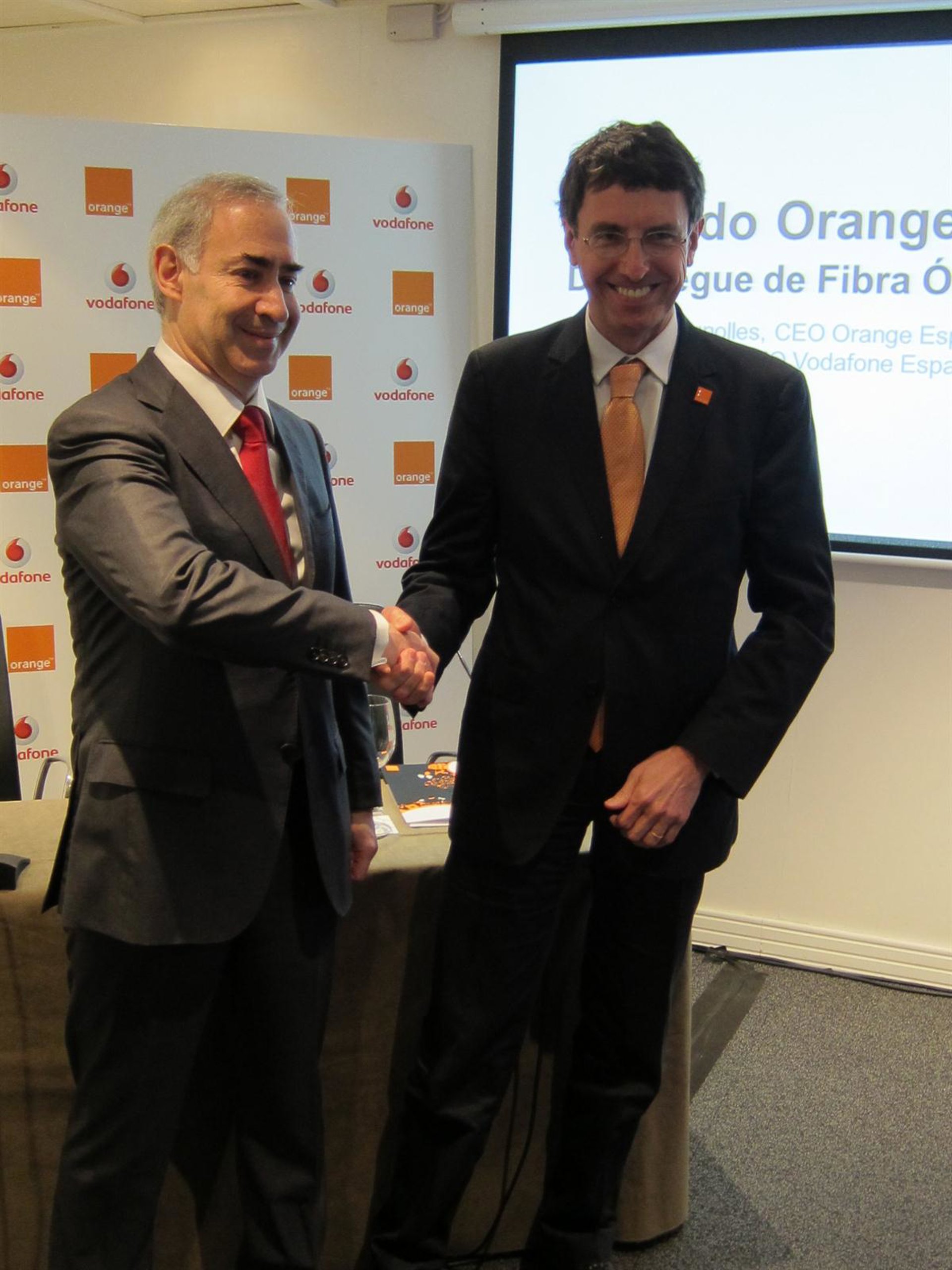 Los consejeros delegados de Vodafone España y Orange España, Antonio Coimbra y Jean Marc Vignolles, han acusado este miércoles a Telefónica de poner trabas en la competencia en fibra y han advertido de que si no alcanzan un acuerdo en verticales acudirán a la Comisión del Mercado de Telecomunicaciones (CMT) para que obligue a la firma presidida por César Alierta a que comparta estas infraestructuras.