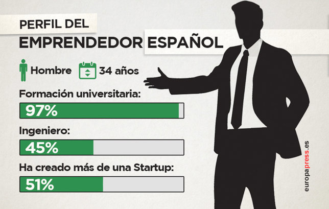 El perfil del emprendedor en España es el de un hombre de 34 años, con titulación de ingeniero --en cualquiera de sus ramas-- y que ya ha decidido arrancar su propio proyecto más de una vez, según aseguran desde la plataforma South Summit, que reúne a las principales 'startups' y grandes compañías del país para favorecer sus colaboraciones y que también concluye que al contrario que en Europa, donde el 'software' copa la actividad de los emprendedores, en España los nuevos proyectos empresariales se centran en el sector servicios.