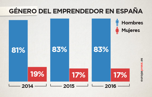 Estos datos, que se desprenden del informe 'Mapa del emprendimiento 2016' realizado por la plataforma, confirman que a pesar de que el emprendedor se ha consolidado como generador de empleo y riqueza, la participación de la mujer en este sector empresarial se ha estancado desde el pasado año.