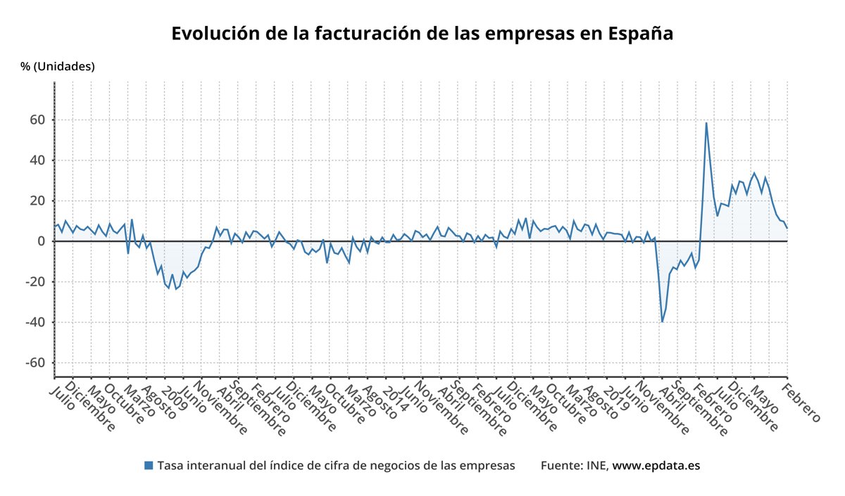 La cifra de negocios de las empresas aumentó un 6,2% el pasado mes de febrero respecto al mismo mes de 2022, moderando en 3,6 puntos la subida registrada el mes anterior, cuando se incrementaron un 9,8%, según el Índice de Cifra de Negocios Empresarial (ICNE) publicado este martes por el Instituto Nacional de Estadística (INE).