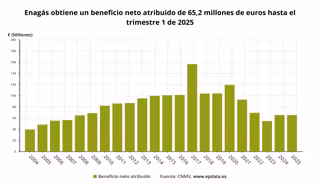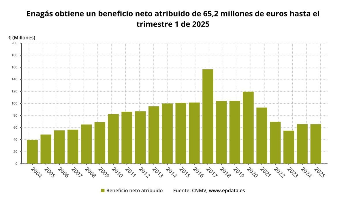 Enagás obtuvo un beneficio neto de 65,2 millones de euros en el primer trimestre del año, cifra en línea con la registrada en el mismo periodo de 2024, y avanza según las previsiones para alcanzar su objetivo anual de unas ganancias de 265 millones de euros, informó la compañía.