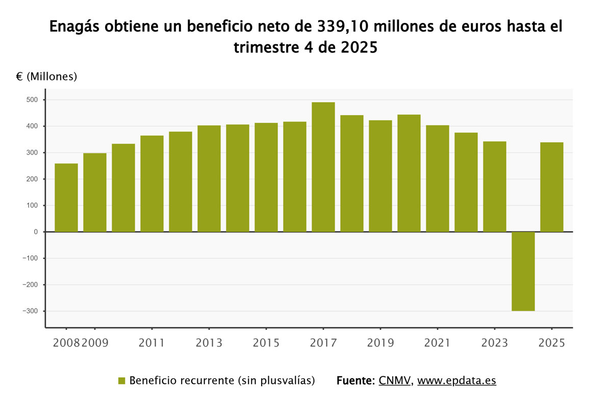 Enagás obtuvo un beneficio neto de 339,1 millones de euros en 2025, frente a las pérdidas de 299,3 millones de euros en el año anterior, en el que se vio lastrado por las minusvalías de la venta de su participación en la estadounidense Tallgrass Energy, informó la compañía, que bate los objetivos marcados para el ejercicio.