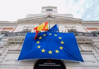 Bandera de la UE sobre la fachada principal de la Real Casa de Correos para conmemorar el Día de Europa, que se celebra el 9 de mayo, en Madrid (España) a 9 de mayo de 2020. - Comunidad de Madrid