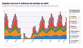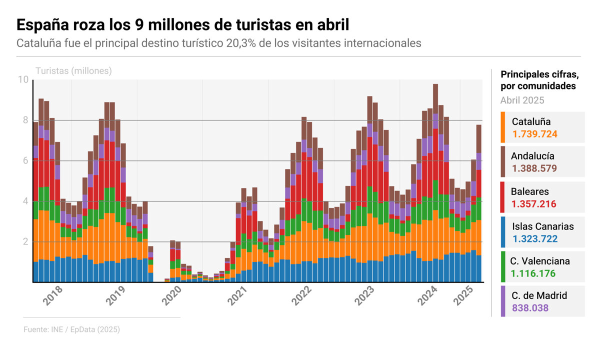 El turismo internacional continúa ganando tracción en España. En abril, el país recibió 8,6 millones de turistas extranjeros, un 10,1% más que en el mismo mes del año pasado, según los datos publicados este lunes por el Instituto Nacional de Estadística (INE). Este aumento de la afluencia ha venido acompañado de un incremento aún más significativo en el gasto total, que se elevó a 10.826 millones de euros, un 14,1% más interanual, marcando un nuevo récord mensual.