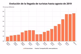España superó los 58 millones de turistas internacionales en los ocho primeros meses del año, un 1,5% más que en el mismo periodo de 2018, según los datos provisionales de la Encuesta de Movimientos Turísticos en Frontera (Frontur) elaborada por el Instituto Nacional de Estadística (INE).