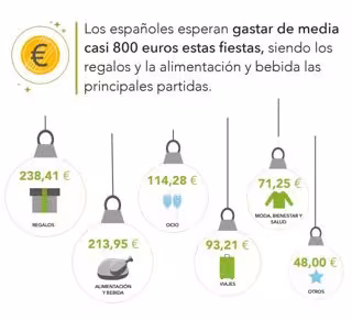 Los españoles tienen la intención de gastar de media 779 euros durante estas fiestas, siendo los regalos, y la alimentación y bebida las principales partidas, con 238 y 214 euros, respectivamente según revela un estudio elaborado por IO investigación para la compañía de financiación Oney.