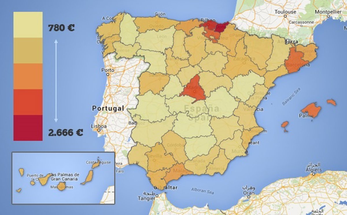 En contraste, la provincia con los precios más bajos es Ciudad Real (779,5 euros), por delante de Cuenca (782,7 euros) y Cáceres (803,6 euros).