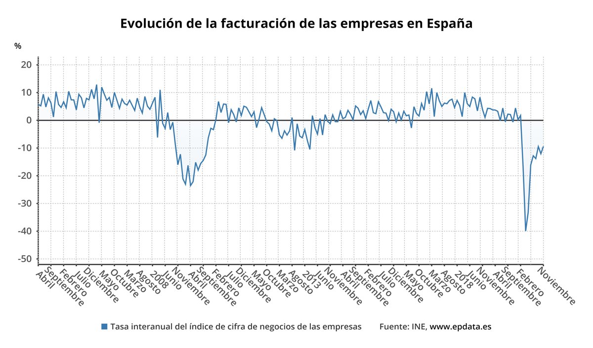 En todo caso, el descenso mensual de la facturación de las empresas registrado en noviembre queda lejos de los desplomes del 25,9% y del 19,4% registrados en abril y marzo, respectivamente.