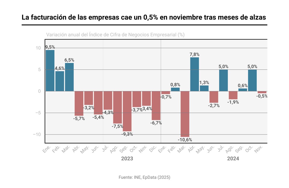 La cifra de negocios de las empresas bajó un 0,5% el pasado mes de noviembre en relación al mismo mes de 2023, según el Índice de Cifra de Negocios Empresarial (ICNE) publicado este miércoles por el Instituto Nacional de Estadística (INE).