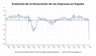 En tasa mensual (abril sobre marzo) y eliminado el efecto estacional y de calendario, la cifra de negocios de las empresas se desplomó un 25,9%.