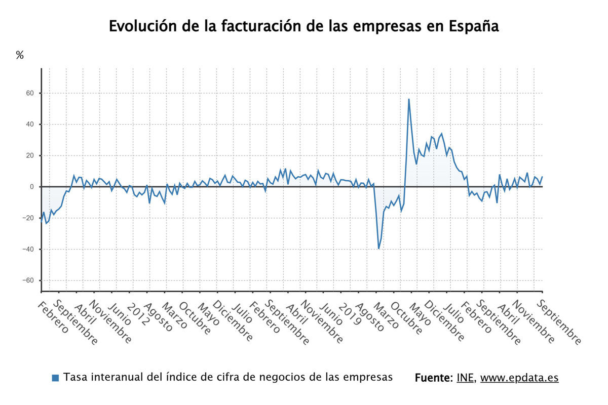 La cifra de negocios de las empresas subió un 6,5% en septiembre en relación al mismo mes del año pasado, tasa casi cinco puntos superior a la de agosto y la más elevada desde el pasado mes de marzo, según el Índice de Cifra de Negocios Empresarial (ICNE) publicado este lunes por el Instituto Nacional de Estadística (INE).