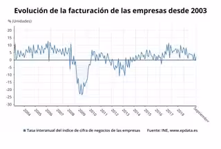 Corregidos los efectos estacionales y de calendario, la facturación de las empresas aumentó en el noveno mes del año un 0,5% respecto a septiembre de 2018, tasa casi un punto inferior a la de agosto. Esta evolución fue consecuencia del repunte de las ventas en servicios (+5%) y comercio (+1,1%), frente a los descensos registrados en el suministro de energía y agua (-7,8%) y en industria (-1,6%).