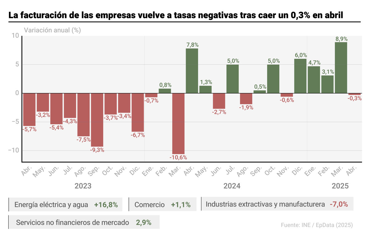 En los cuatro primeros meses de 2025, la cifra de negocios de las empresas registró una subida media del 4,1% en relación al mismo periodo de 2024, con las empresas de suministro de energía eléctrica y agua a la cabeza (+24,3%).