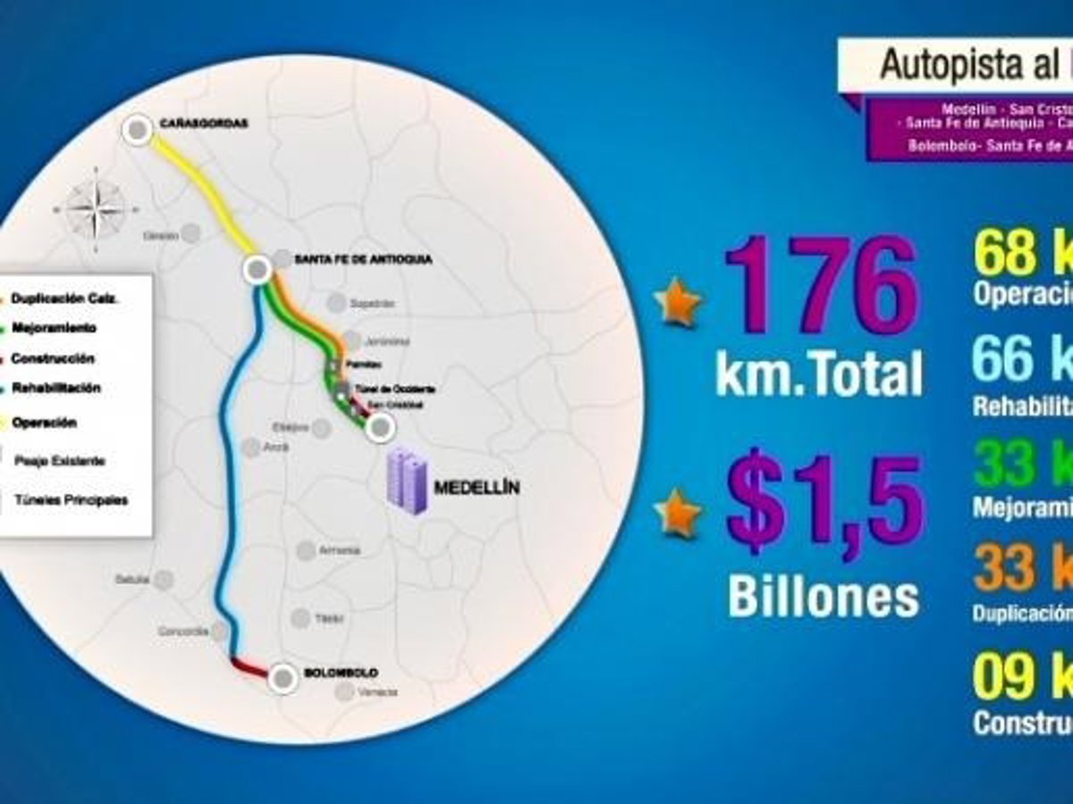 El proyecto contempla mejorar el trazado de 176 kilómetros de longitud de la vía comprendido entre el Túnel de Occidente, próximo a Medellín, y Santa Fe de Antioquía y Bolomlobo.