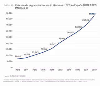 El informe apunta que el volumen del negocio 'online' se duplicó desde 2018, cuando su facturación en España fue de 41.509 millones de euros, y que se ha multiplicado casi por seis desde 2013, cuando el comercio digital en el país movió 14.610 millones de euros.