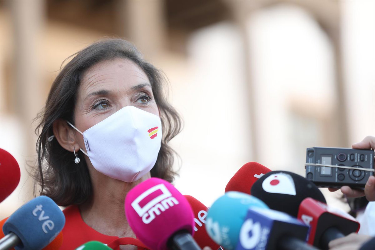 La ministra de Industria, Turismo y Comercio, Reyes Maroto, ofrece declaraciones a los medios al acudir al acto de presentación oficial del parque temático de Puy du Fou, a 10 de septiembre de 2021, en Toledo, Castilla - La Mancha (España). Toledo acoge - Isabel Infantes - Europa Press