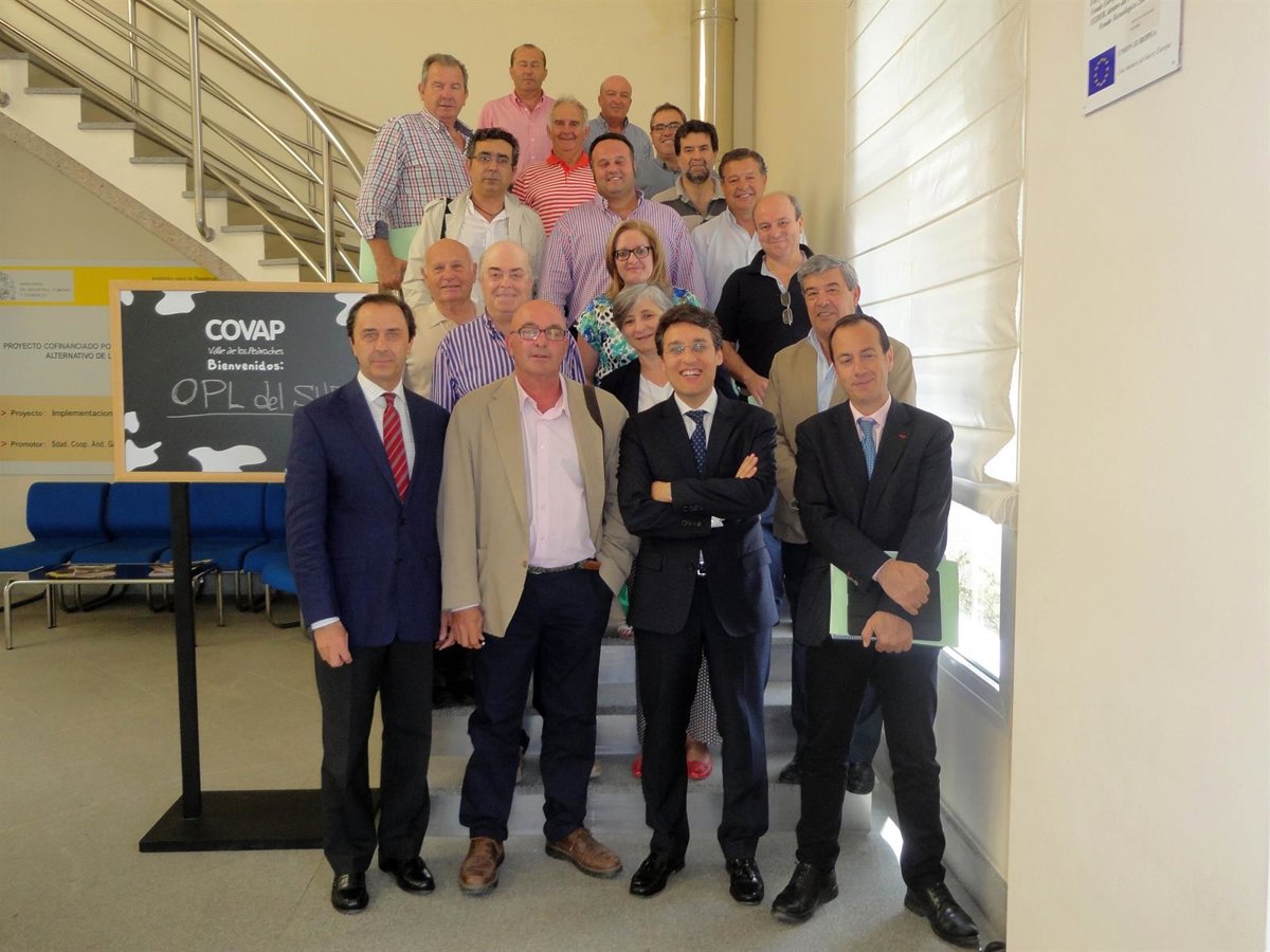 El director general de Producciones y Mercados Agrarios del Ministerio de Agricultura, Alimentación y Medio Ambiente (Magrama), Fernando Miranda; el director General de Producción Agrícola y Ganadera de la Junta de Andalucía, Rafael Olvera, y el presidente de la Cooperativa del Valle de los Pedroches (Covap), Ricardo Delgado Vizcaíno, se han reunido con los ganaderos de la Organización de Productores de Leche (OPL) del Sur, para analizar la evolución del sector tras la desaparición de las cuotas lácteas.