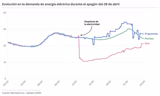 A las 12.33 horas de este lunes y durante cinco segundos desaparecieran "súbitamente" 15 gigavatios (GW) de la red eléctrica, el equivalente al 60% de la energía que se estaba consumiendo en ese momento, según informó el lunes por la noche una comparecencia el presidente del Gobierno, Pedro Sánchez, provocando un apagón masivo que ha dejado sin luz a la Península Ibérica durante buena parte del día.