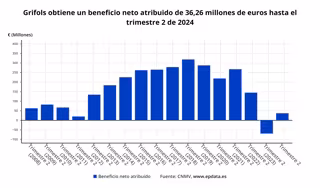 Grifols cerró el primer semestre del año con un beneficio neto reportado de 36 millones de euros, frente a las pérdidas de 70 millones del mismo periodo de 2023, mientras que el beneficio neto excluyendo extraordinarios fue de 152 millones, según ha informado la compañía, que ha confirmado sus previsiones para el año.