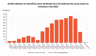 Grifols obtuvo un beneficio de 3,32 millones de euros en los nueve primeros meses de este año, lo que supone un descenso del 98,2% respecto al mismo periodo del ejercicio precedente, según ha informado este jueves la compañía, que ha confirmado además el cierre de la operación de venta de la china Shanghai RAAS en el primer semestre de 2024.